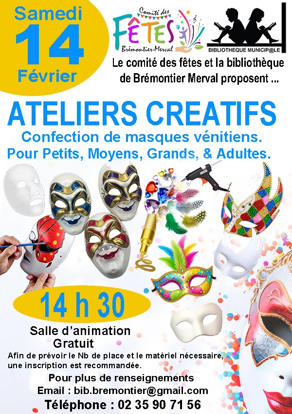 Venez confectionner votre masque vénitien avec plumes, dentelles, paillettes...le samedi 14 février. Atelier pour tous.